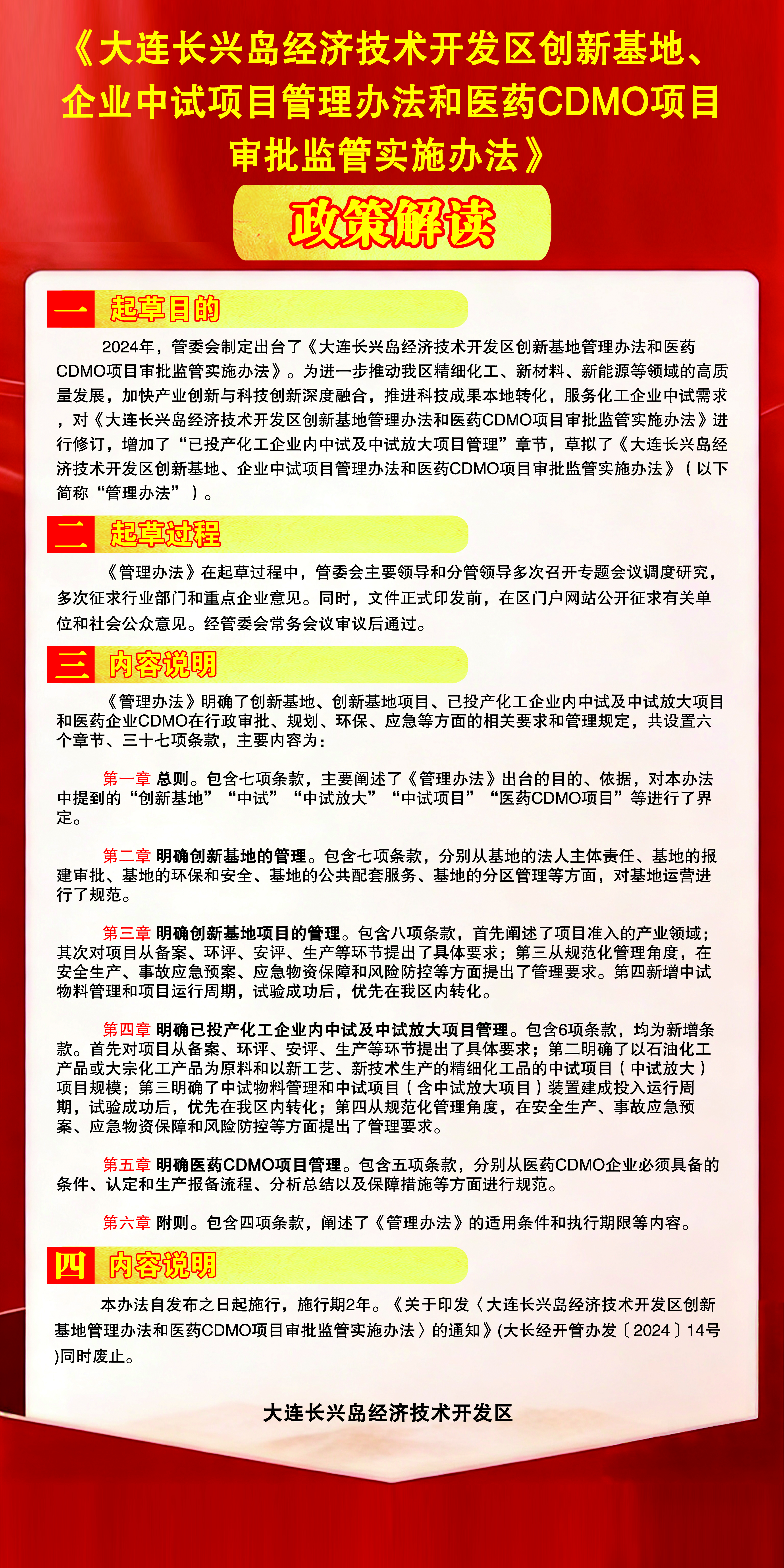 【图解】《大连长兴岛经济技术开发区创新基地、企业中试项目管理和CDMO项目审批监管实施办法》政策解读