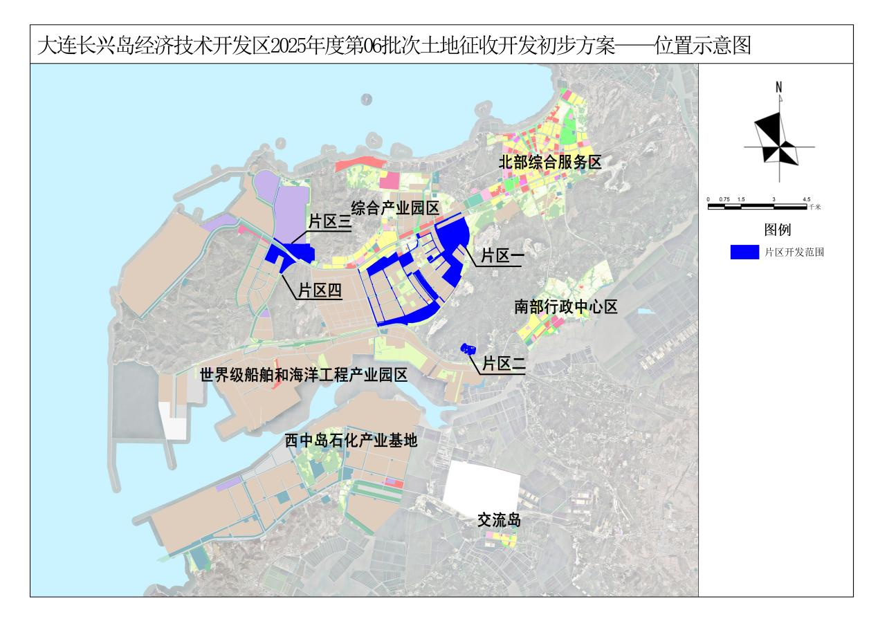 大连长兴岛经济技术开发区2025年06批次土地征收成片开发范围涉及4个片区,总面积784.9848公顷,位于长兴岛街道。项目位置详见附图。