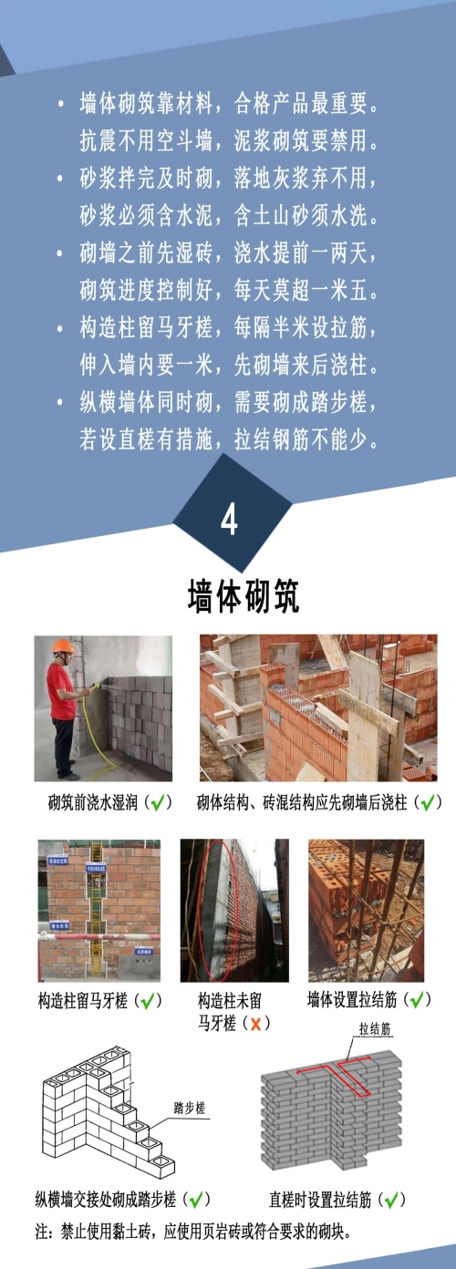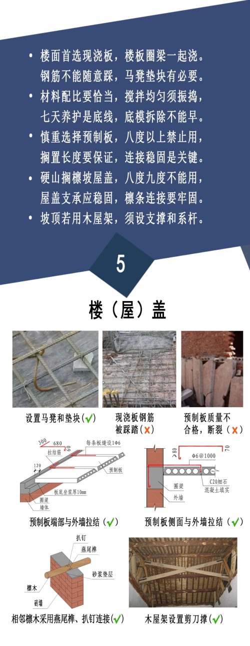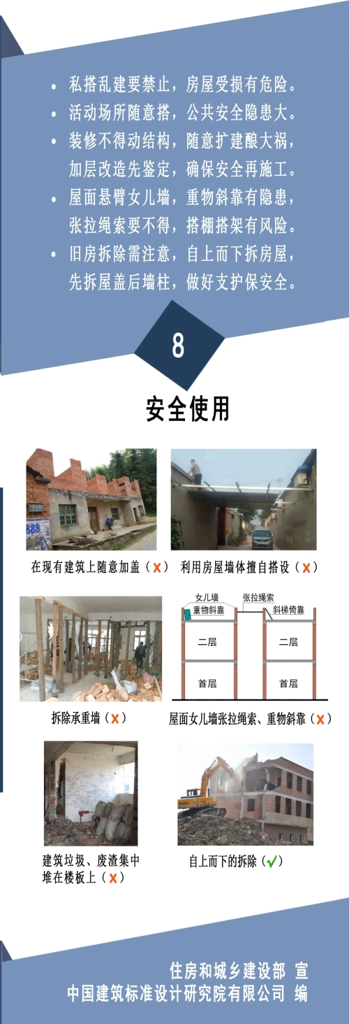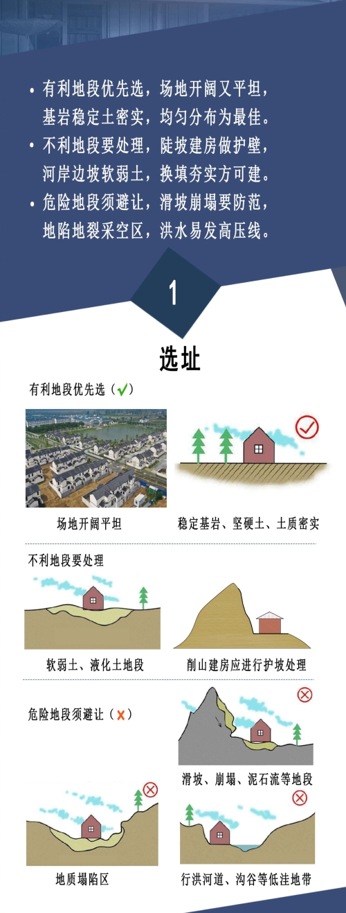 为保障农村建房安全,防止重大安全事故发生,保护好人民群众生命财产安全,住建部组织编制了《农村自建房安全常识“一张图”》,通过简明扼要的文字描述和生动丰富的示例图片,从农房建设选址、房屋布局、地基基础、墙体砌筑、楼(屋)盖、模板支架、使用和维护等方面作出安全提示,供各地区在农村建房中推广使用。