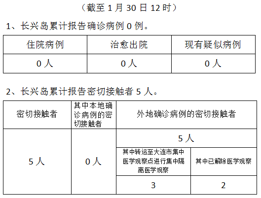 大连长兴岛经济区新型冠状病毒感染的肺炎疫情最新情况(截至1月30日12时)