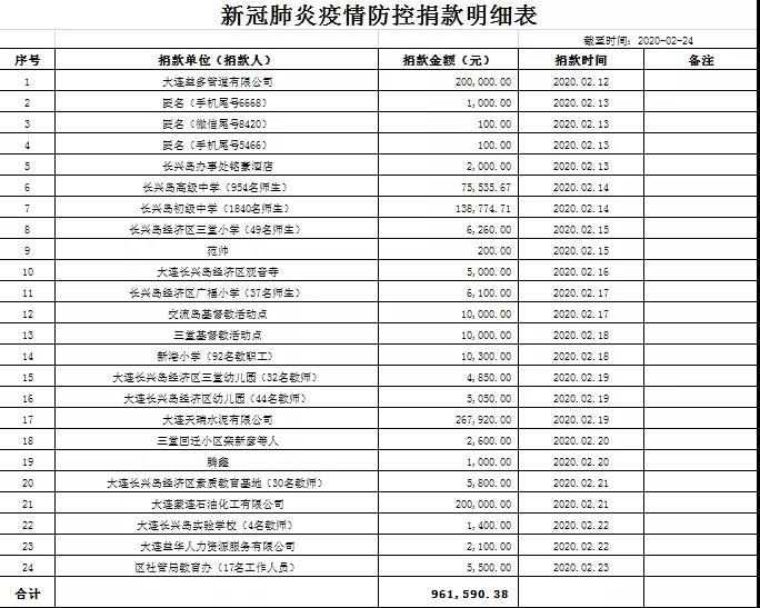 疫情无情,人间有爱。连日来,长兴岛经济区各界纷纷筹集善款、捐赠物资,用一次次暖心捐助为抗击疫情加油助力。2月12日-2月24日,大连长兴岛经济区新型冠状病毒感染的肺炎疫情防控指挥部办公室共收到社会捐款961590.38元。