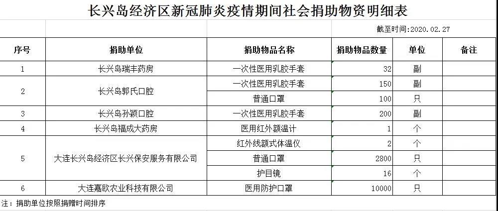 疫情无情,人间有爱。2月12日-2月27日,大连长兴岛经济区新型冠状病毒感染的肺炎疫情防控指挥部办公室共收到社会捐款961590.38元。(附捐款、捐物明细)