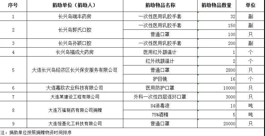 长兴岛经济区新冠肺炎疫情期间社会捐助物资明细(截至2020年3月6日)