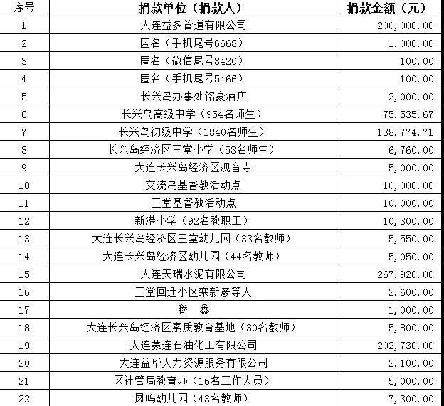 疫情防控阻击战打响后,长兴岛经济区上下一心,众志成城。从企业到学校、从单位到家庭再到个人,都在用自己的方式,尽绵薄之力,献一份爱心,为疫情防控助力。星星之火,汇集成了驱散阴霾的光亮。截至2020年3月6日,长兴岛经济区新型冠状病毒感染的肺炎疫情防控指挥部办公室累计接收社会捐款1663870.38元。