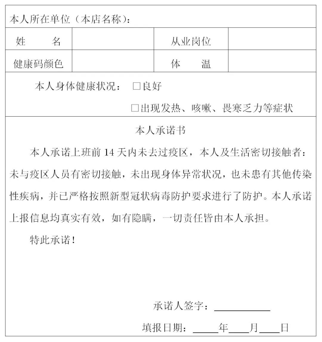 1.公示职工健康证明。包括职工姓名、性别、年龄和照片,职工复工前14天的健康状况等内容。窗口工作人员,体温正常且健康码呈绿色,上岗前7日内核酸检测结果呈阴性,方可上岗。关注重点地区来连人员,重点地区来连职工按相关规定执行。