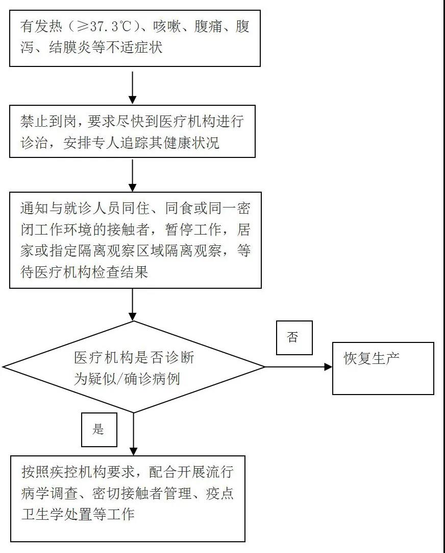 员工在每日健康监测时,有体温高于37.3℃、咳嗽、流涕、腹泻、结膜炎等不适症状的,禁止到岗,要求尽快到医疗机构进行诊治,安排专人追踪其健康状况。同时,通知与就诊人员同住、同食或同一密闭工作环境的接触者,暂停工作,居家或指定隔离观察区域隔离观察,等待医疗机构检查结果。