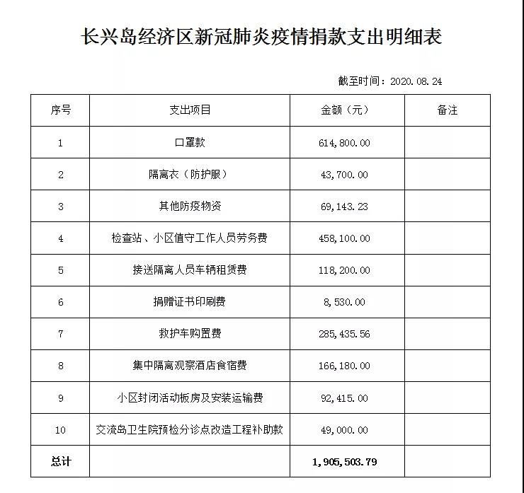 自我区新冠肺炎疫情防控募捐倡议书发布以来,全区企事业单位及社会各界人士充分发挥社会责任感,奉献爱心,踊跃捐款,积极支持我区新冠肺炎疫情防控工作。截至8月24日,共收到社会捐款1,905,503.79元,目前已全部使用,现将具体使用情况予以公示。衷心感谢社会各界的支持和爱心,希望全岛人民继续携手共同做好我区的疫情防控工作,众志成城,万众一心,共克时艰,战胜疫情!