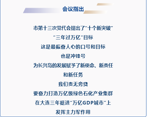 4月6日,长兴岛经济技术开发区党工委书记、管委会主任郭长明主持召开区管委会月例会,强调16项重点工作,要求全区上下按照市第十三次党代会提出的“十个新突破”“三年过万亿”目标,群策群力、共同努力,开创新局面,以优异成绩向党的二十大胜利召开献礼。