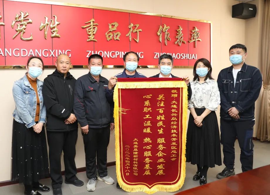 4月21日,大连奥晟隆新材料有限公司向区总工会送上一面“关注百姓民生、服务企业发展,心系职工温暖、热心服务基层”锦旗,感谢工会组织疫情防控期间的“雪中送炭”。
