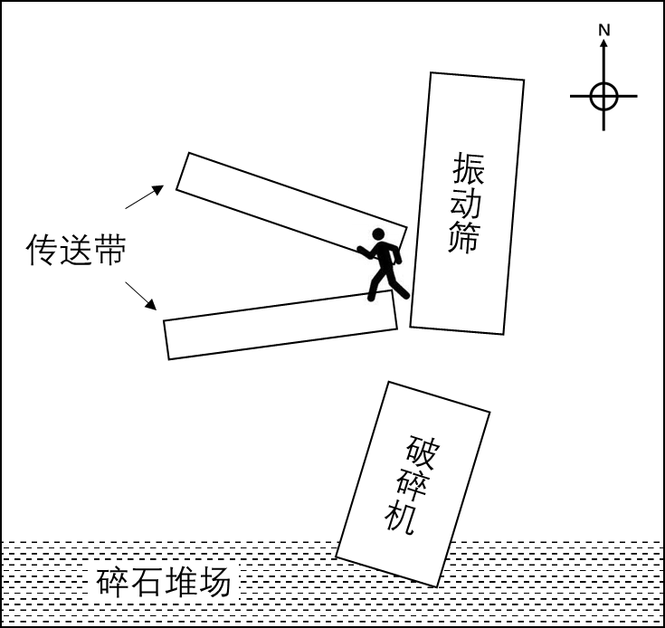 环境方面,事故发生在冬季室外,气温较低,易造成反应迟钝;破碎、筛分作业有较大噪声,易造成头昏疲倦;作业场所地面碎石较多,不平整,易绊倒、滑倒。