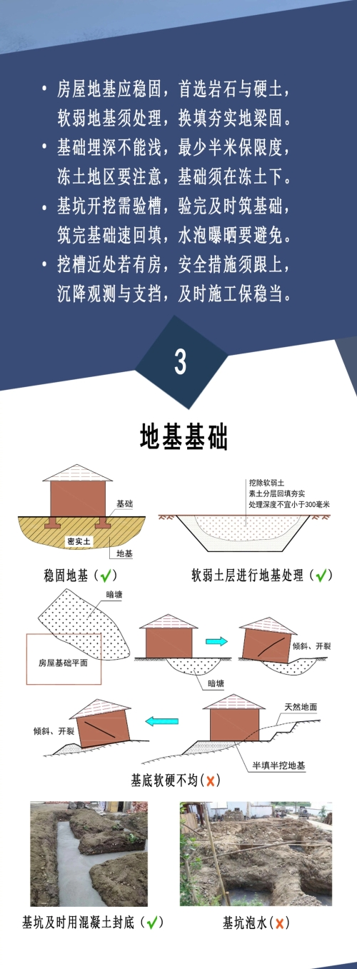 为保障农村建房安全,防止重大安全事故发生,保护好人民群众生命财产安全,住建部组织编制了《农村自建房安全常识“一张图”》,通过简明扼要的文字描述和生动丰富的示例图片,从农房建设选址、房屋布局、地基基础、墙体砌筑、楼(屋)盖、模板支架、使用和维护等方面作出安全提示,供各地区在农村建房中推广使用。